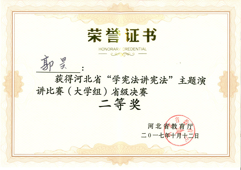 10月11-12日,第二届全国学生“学宪法,讲宪法”演讲比赛河北赛区总决赛在河北艺术职业学院举行。我院选手机械设计与制造1602班郭昊同学与来自河北大学、河北工业大学等22所高校的参赛选手同台竞技,经过激烈角逐,郭昊同学荣获河北省赛区总决赛二等奖,展现了我院优秀的育人水平和良好的精神风貌,为我院争得了荣誉。
