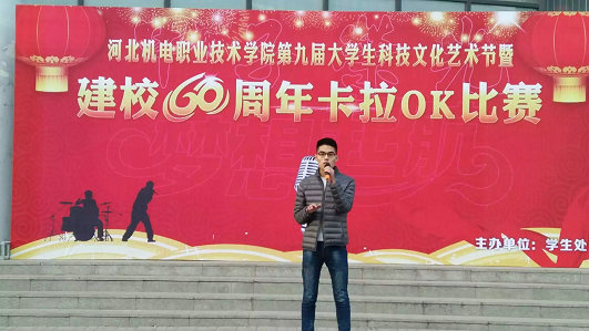 为庆祝学院建校60周年暨第九届科技文化艺术节的开展,2016年12月8日下午四点由学生处主办的“河北机电职业技术学院卡拉OK比赛”在学院食堂南广场成功举办并取得圆满成功。本次活动有李根山老师、韩军武老师、王庆报老师、刘为民老师、谢岩老师担任评委,学生工作部周卫忠部长出席了本次活动。