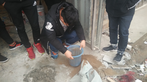 实训第3周的第二站为邢台市南大郭附近一个正在装修的蛋糕店,此次实训的目的在于使学生直观的观看装修施工过程。在装修现场,学生们虚心的向工人师傅请教了关于装修施工的一些疑问,工人师傅进行了解答。最后,学生们主动动手帮助工人师傅筛筛子、搅拌水泥......,体会了劳动的艰辛与不易。