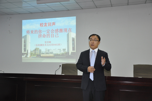 常洪峰同学1998年毕业后先后在华龙机械厂,西安文化公司,平安保险公司,太平洋保险公司工作,现任太平洋保险公司石家庄支公司副总经理。报告题目为《将来的你一定会感谢现在拼命的自己》。他讲述了自己毕业十八年的奋斗经历和心路历程。他说学生时代是一个人最美好最快乐和最幸福的时光。一个人如果没有一技之长,没有立足之本。要勇争第一,只要今天比昨天更好,每天进步一点点,这就是成功的开始。要懂得技巧,多动脑,在工作和学习中运用技巧。要学会感恩,要感恩父母、感恩老师、感恩同事。