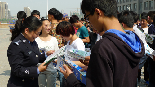 参加活动的学生在学院食堂门口观看了“珍爱生命、远离毒品”展览,市公安局干警给学生分发了宣传材料,讲解了毒品在我市传播的情况及其危害。