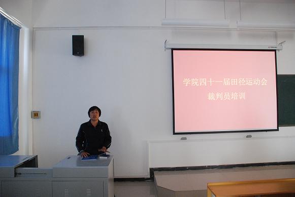 5月6日 下午三点半,第41届院运动会裁判员培训会议在教学楼B座305室顺利召开,会议由教务处赵双全处长主持,体育工作部张平部长宣读裁判员名单,张兆隆副院长出席会议, 70多名裁判参加了本次会议。