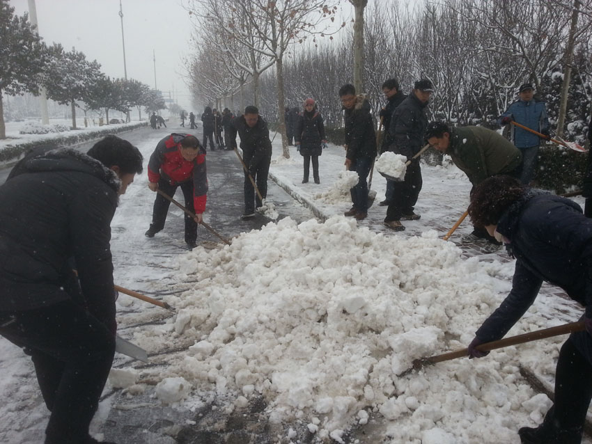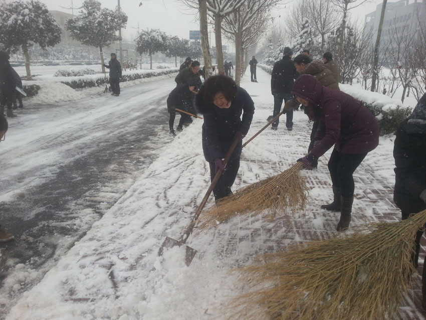按照邢台市委市政府部署,2月7日(大年初八)上午,我院组织全体教职工,顶着户外寒风,冒着纷扬的雪花,清扫了单位卫生责任区。在自行车道上,我院的铲雪车很快堆起了一堆堆雪堆,在人行道上,教职工把路面上的积雪移动绿化带内,敲打树干上的的积雪。大家齐心协力,争先恐后形成了一道美丽的风景线,圆满完成了市委市政府安排的任务。