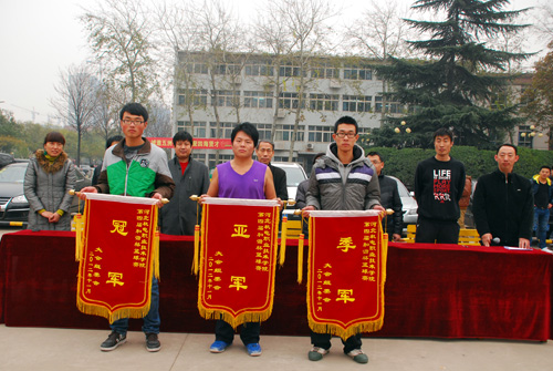 团委书记籍宇主持闭幕仪式,总裁判长李楠老师宣布比赛成绩,学院副院长王明耀、学生工作部部长周卫忠、体育工作部部长张平分别给前三名队伍发奖。王明耀副院长在讲话中鼓励大家多开展有益的活动,提高素质,展示风采,获得物质、精神双丰收。