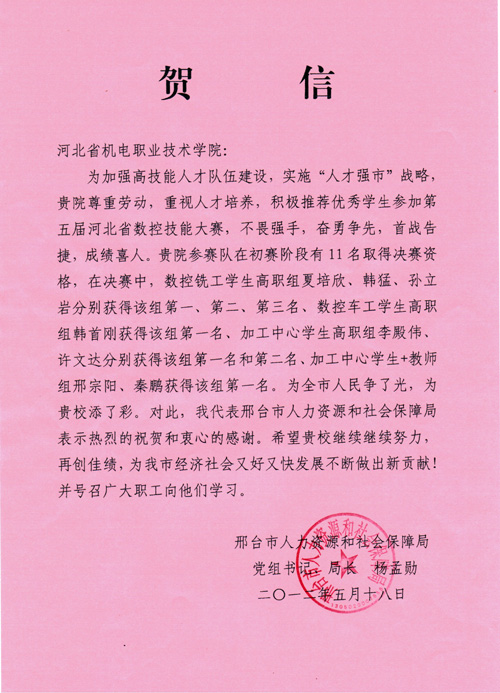 2012年5月18日下午,邢台市人力资源和社会保障局副局长田朝晖、职业能力建设科科长秦继山代表市人社局专程为我院送来贺信,祝贺我院代表队在第五届河北省数控技能大赛取得多个第一的好成绩。我院院长马东霄、副院长赵国增、教务处长赵双全和现代系的有关领导、教师喜接贺信。