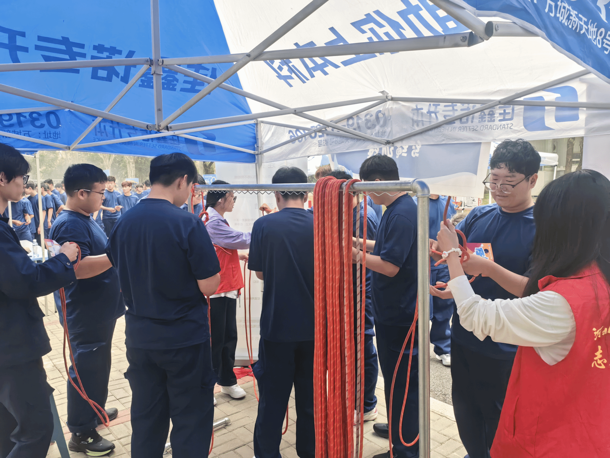 在结绳训练体验区,培训师通过实物与图文教学结绳方法,帮助新生掌握在不同场景下的逃生技能。