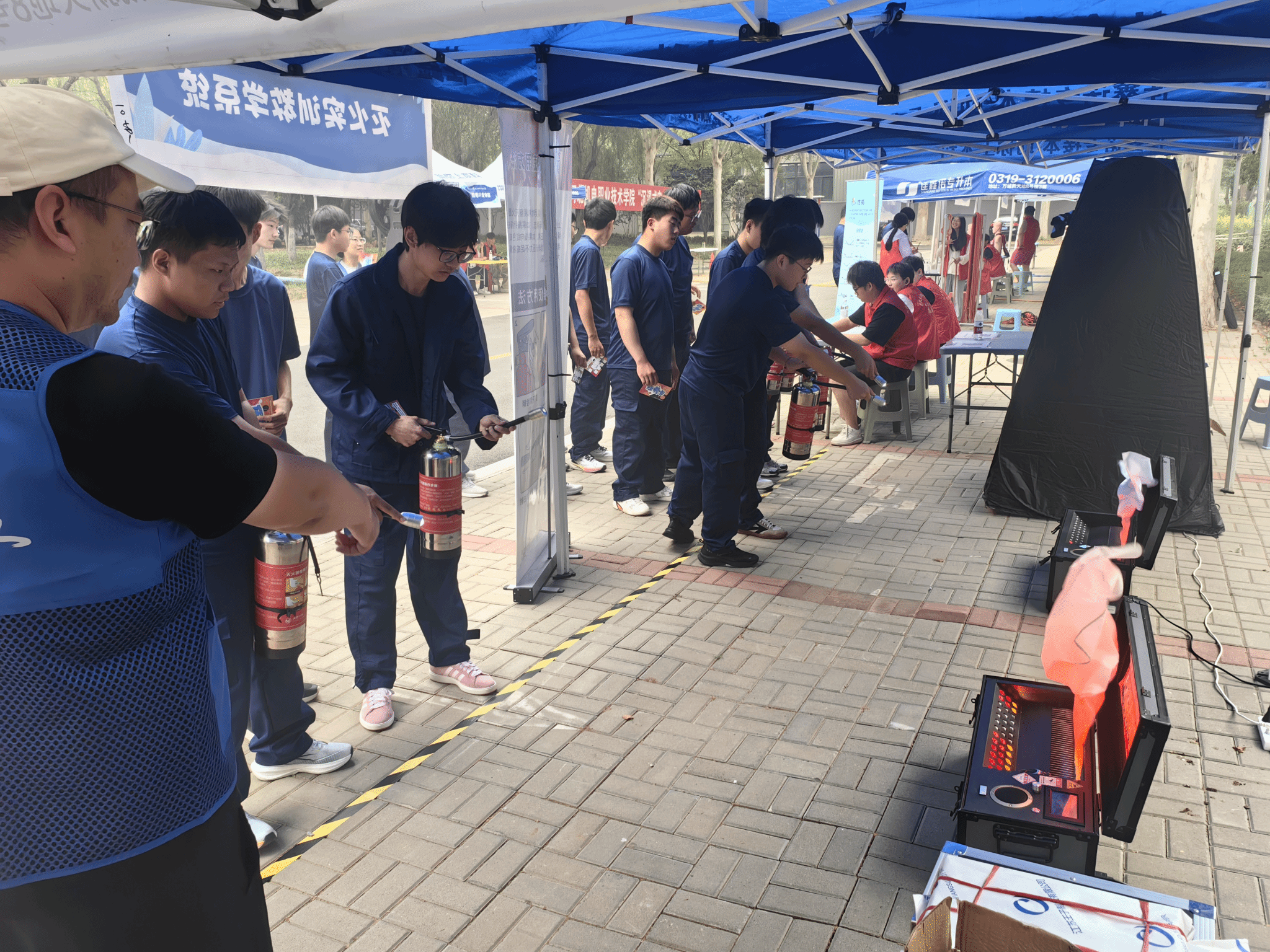 在灭火实训体验区,新生在培训师指导下,借助模拟灭火器,实操灭火步骤,熟练掌握灭火技巧。