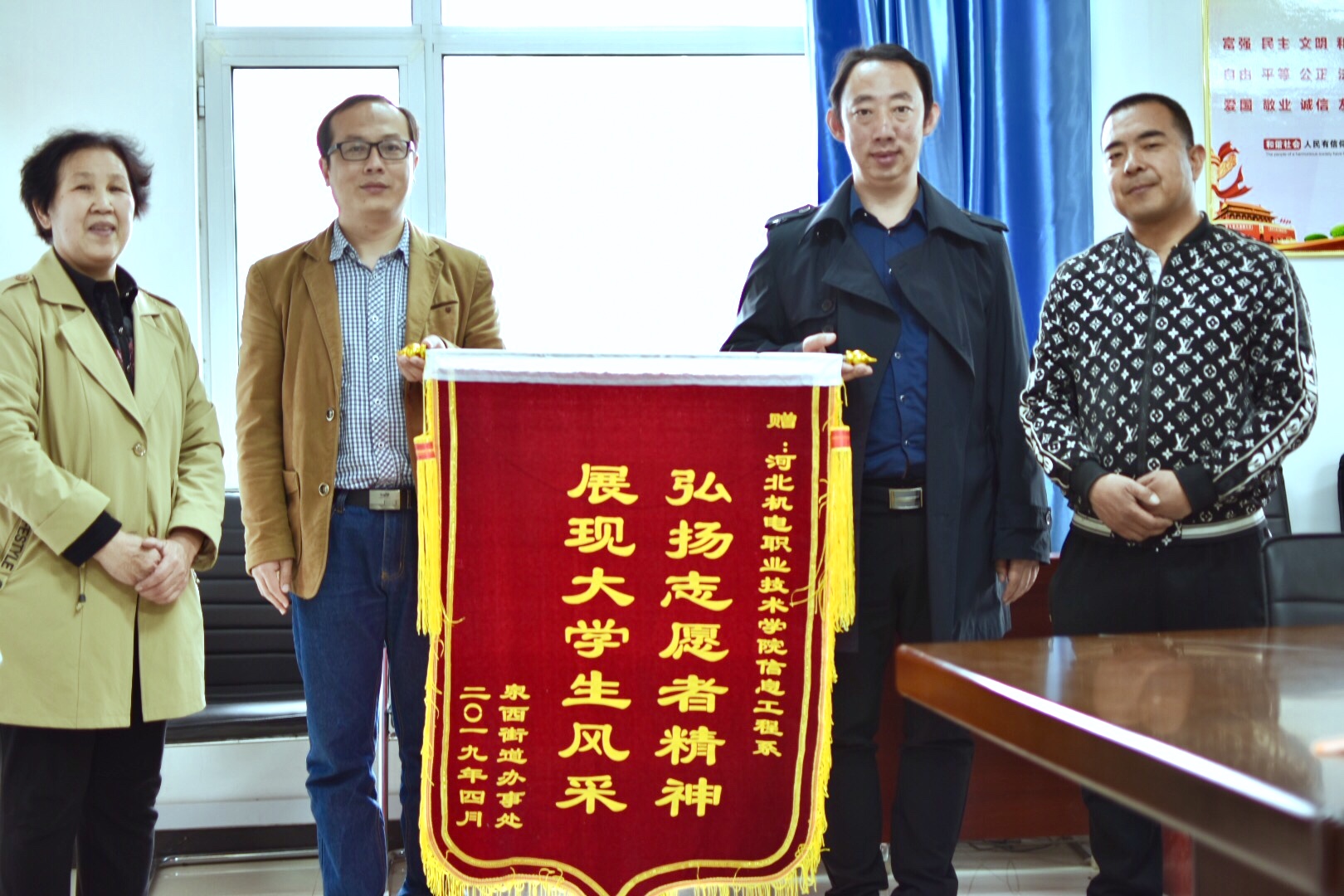 4月19日,邢台市桥西区泉西街道文苑社区党支部书记刘秀珠等代表来到我院,为信息工程系送上一面印有“弘扬志愿者精神,展现大学生风采”的锦旗,真诚地对我院长期以来的社区志愿服务表示感谢,信息工程系党总支书记籍宇、...