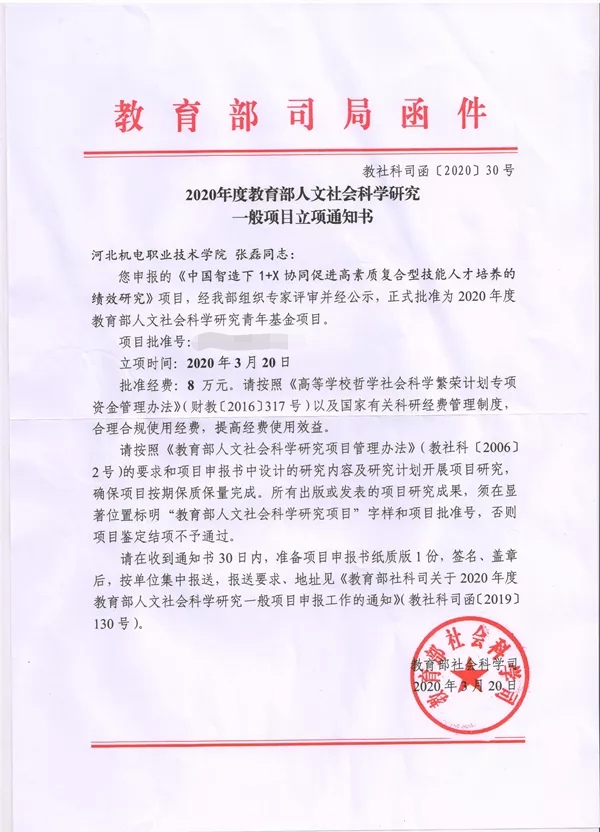 近日,教育部社会科学司公布了2020年度教育部人文社会科学研究一般项目立项名单,我院张磊老师主持申报的“中国智造下1+X协同促进高素质复合型技能人才培养的绩效研究”项目获得资助立项,资助经费8万元。这是我院首次获得该类别项目立项,...