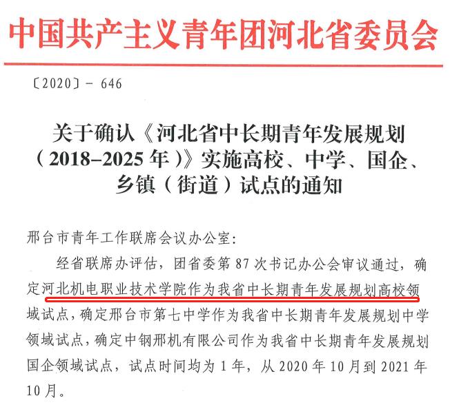 青年是国家的未来、民族的希望、时代的力量,近日,经省联席办评估,团省委第87次书记办公会审议通过,确定我院为河北省中长期青年发展规划高校领域试点单位,从2020年10月到2021年10月,试点时间为1年。 中长期青年发展规划是习近平总书记从确保党的事业薪火相传、...
