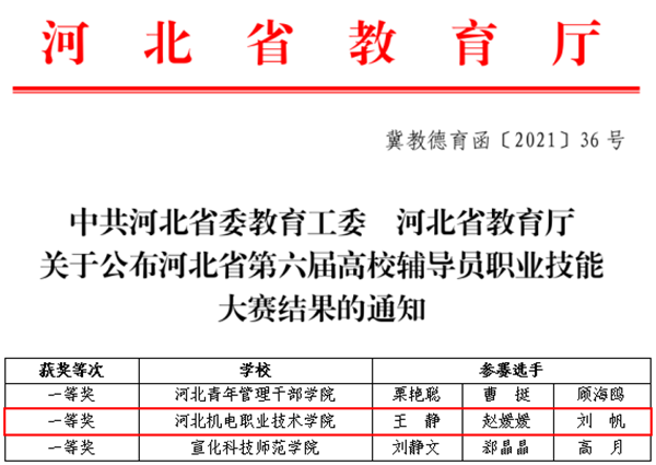 近日,河北省教育工委、河北省教育厅公布河北省第六届高校辅导员素质能力大赛结中,由我院王静、赵媛媛、刘帆三位老师组成的代表队荣获本次大赛专科组一等奖。 河北省高校辅导员素质能力大赛是推进辅导员队伍专业化职业化建设的重要平台,...