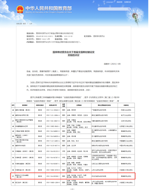10月12日,全国教材工作会议暨首届全国教材建设奖表彰会在京召开,我院张兆隆副院长主编的《数控加工工艺与编程(第二版)》荣获全国优秀教材(职业教育与继续教育类)二等奖。 全国教材建设奖是教材领域的最高奖,...