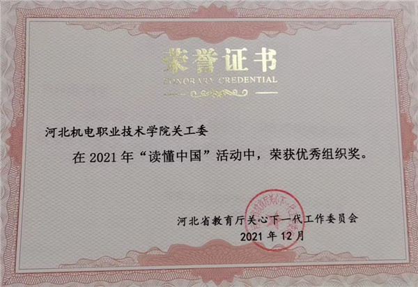 近日,省教育厅关工委公布了2021年“读懂中国”活动作品评审结果。学院报送的征文作品全部获奖。学院获优秀组织奖,这是学院继2019年、2020年后,再次取得此项荣誉! 按照教育部、省教育厅关工委的部署,自2021年3月,...