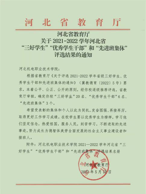 近日,河北省2021—2022学年“三好学生” “优秀学生干部”和“先进班集体”评选结果公开发布,我院共20名学生荣获“省级三好学生”荣誉称号、6名学生荣获“省级优秀学生干部”荣誉称号、3个班级荣获“省级先进班集”...