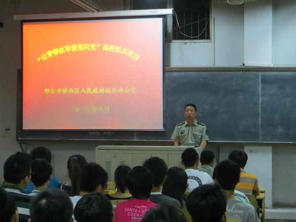 为积极响应国家号召,鼓励在校大学生踊跃参军,6月21日上午,我院学生处联合军分区及芗城区人武部,在梯教三举行2013年征兵宣传活动。 本次活动分三部分:第一,观看征兵影片“让青春在军营里闪光”;第二,请驻邢某部大学生军官做“...
