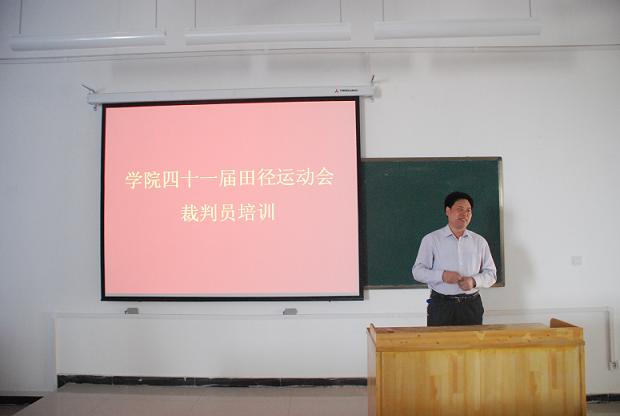 5月6日 下午三点半,第41届院运动会裁判员培训会议在教学楼B座305室顺利召开,会议由教务处赵双全处长主持,体育工作部张平部长宣读裁判员名单,张兆隆副院长出席会议, 70多名裁判参加了本次会议。 张院长对各位裁判员提出四点要求:...