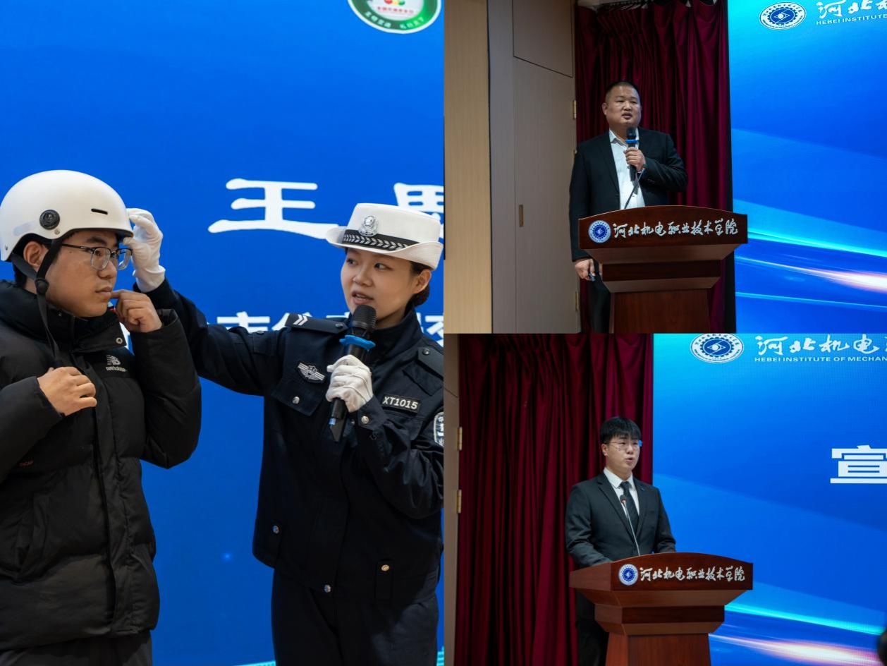 邢台市九洲驾培集团校长以“握好心中方向盘 走好人生幸福路”为主题讲授交通安全课。邢台市公安局交通管理支队民警王思雨现场实操讲解如何正确佩戴电动车头盔,并将这顶安全头盔赠予上台配合的学生。我校汽车工程系王昭然同学作为学生代表,以铿锵有力的语气发出倡议,引发全场共鸣,现场师生纷纷鼓掌响应。