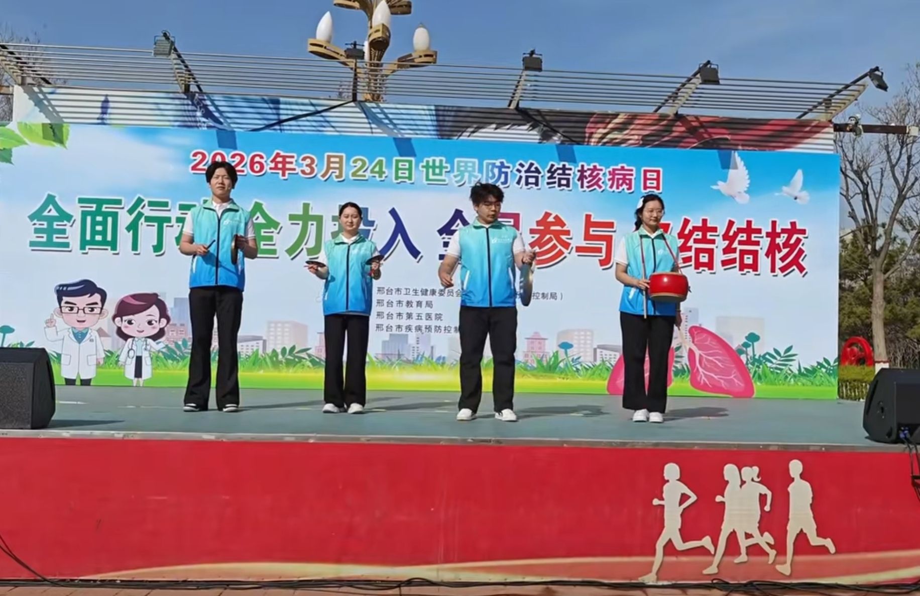 3月22日上午,由邢台市卫健委、市教育局主办的2026年结核病防治主题宣传活动在七里河体育公园举行。我校医务室李合英主任作为高校代表,带领7名学生受邀参加。我校红十字社团的四名学生带来的结核防治三句半表演,以生动活泼、通俗易懂的形式,将结核防控知识融入趣味节目,语言简洁、节奏鲜明,赢得现场观众一致好评。