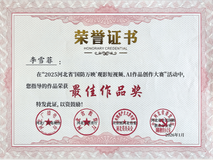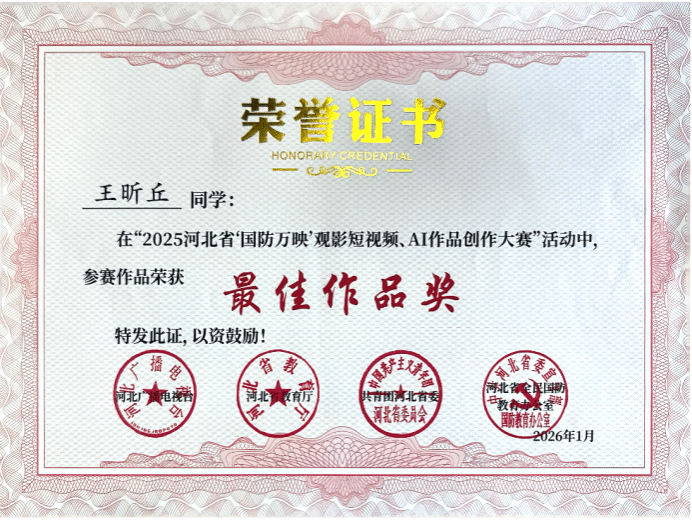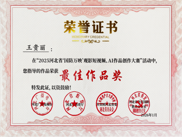 近日,由省教育厅、团省委、河北广播电视台和省全民国防教育办公室联合主办的“2025河北省‘国防万映’公益展映影片进校园活动”公布评选结果。我校共有7件作品在短视频与AI作品创作赛道中脱颖而出,荣获最佳作品奖。