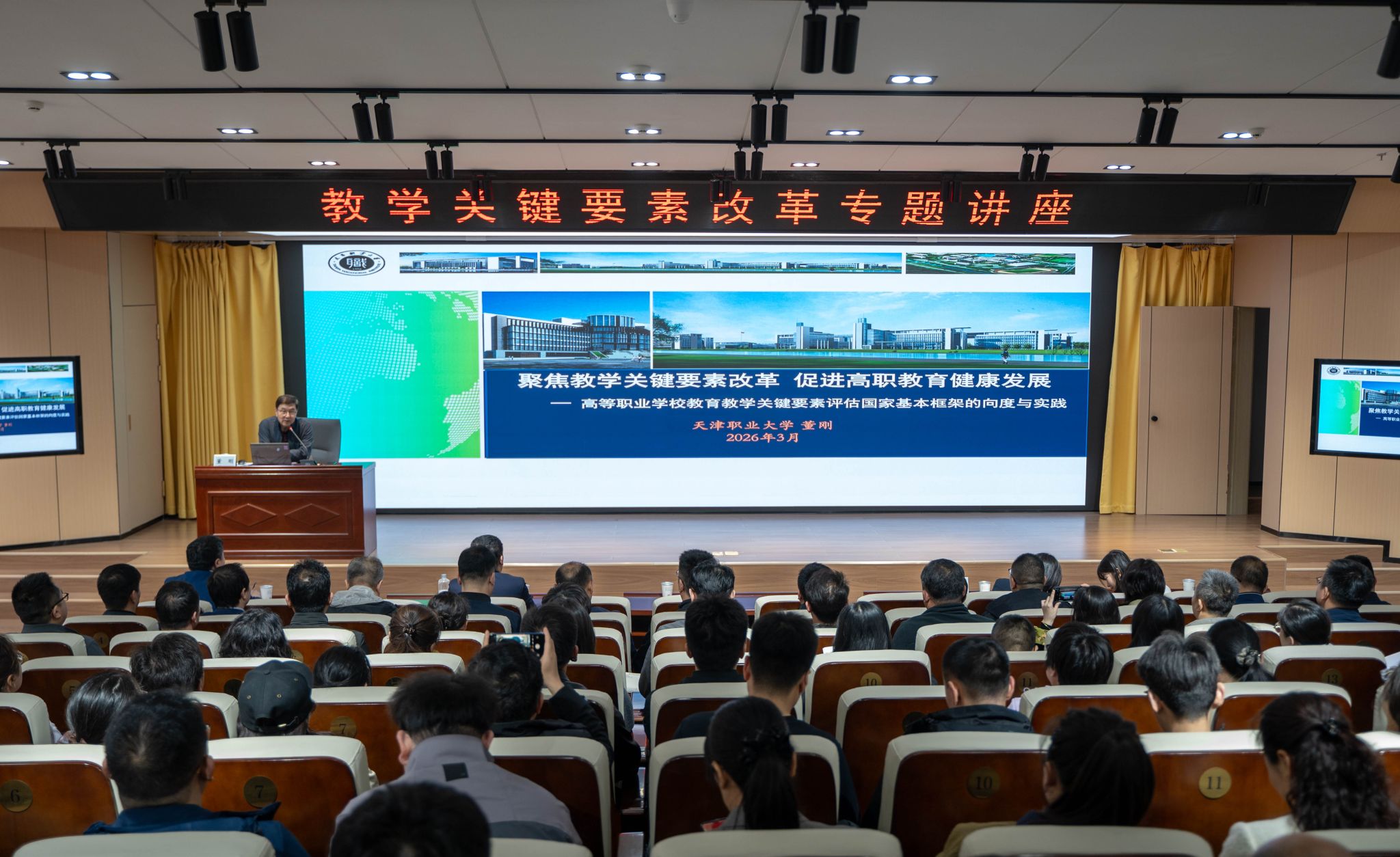 为系统谋划学校 “十五五”发展蓝图,精准聚焦教学关键要素改革,持续推动办学质量与内涵建设双提升,3月27日,学校特邀国务院政府特殊津贴专家,原天津职业大学校长,第九、十届国家督学,全国高等职业学校校长联席会议荣誉主席,全国高职教育领域权威专家董刚教授,作题为《高等职业学校教育教学关键要素评估的向度与实践》的专题讲座。讲座由我校副校长张能云主持。