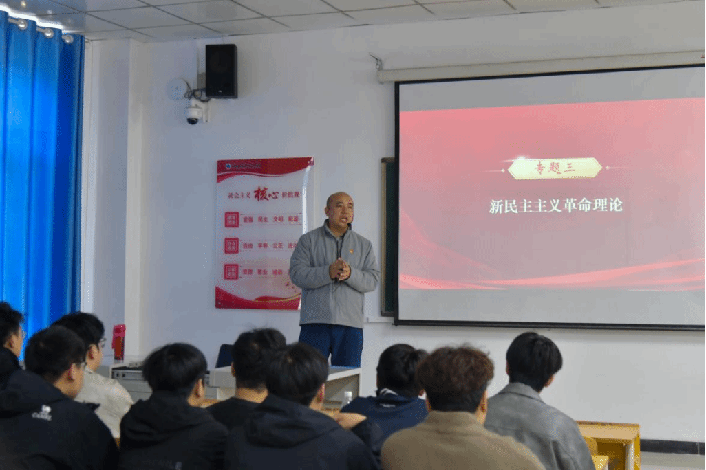 郭华东老师为汽车检测2403班学生讲授了《毛泽东思想和中国特色社会主义理论体系概论》课程,他以“新民主主义革命理论形成的国情依据、时代背景和实践基础”为中心,向同学们讲述了新民主主义革命理论何以在近代中国能够形成,引导同学们从中汲取智慧,坚定理想信念,自觉用党的创新理论武装头脑,将个人发展融入国家复兴伟业,在科学理论指引下走好人生之路。