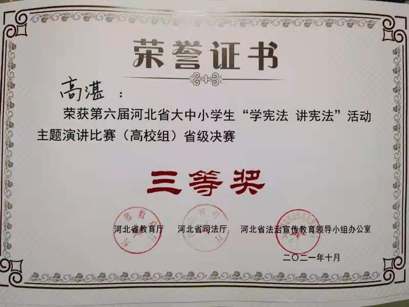 10月11日至12日,河北省教育厅、河北省司法厅、河北省法治宣传教育领导小组举办的河北省第六届大中小学生“学宪法、讲宪法”大赛暨全国选拔赛在石家庄举行,我院推荐选拔的机械工程系学生高湛在比赛中以精彩的演讲荣获高校组三等奖,院团委郝敏老师获优秀指导老师奖。