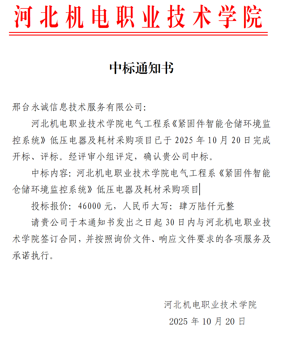 《紧固件智能仓储环境监控系统》低压电器及耗材采购项目中标通知书