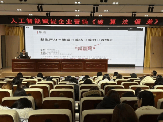 方传兵从工业设计与数字技术融合创新、数字化营销实战策略、创意经济生态等多个维度展开分享。方博士结合西贝莜面村等知名企业实操案例,深入解析了算法偏差破解、信息茧房突破、平台流量机制等核心问题,系统阐释数据、算法、算力与反馈环构成的 “新生产力” 体系,让师生明晰人工智能在数字化营销领域的应用路径。
