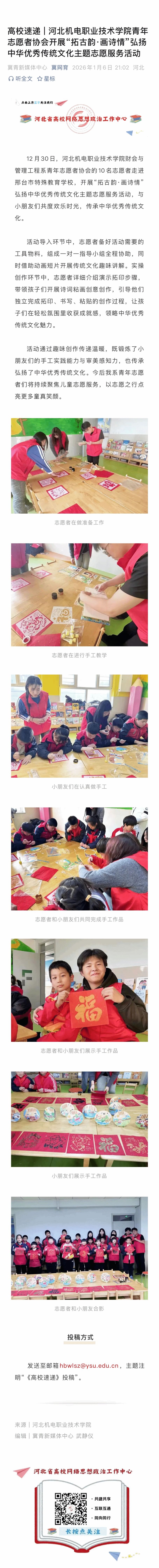 近期,我校财会与管理工程系青年志愿者协会开展的“拓古韵·画诗情”弘扬中华优秀传统文化主题志愿服务活动取得良好成效,活动事迹被河北省高校网络思想政治工作中心冀网育公众号报道。活动中,志愿者走进邢台市特殊教育学校,以诗词贴画创意创作为载体,带领孩子们沉浸式体验传统文化魅力。