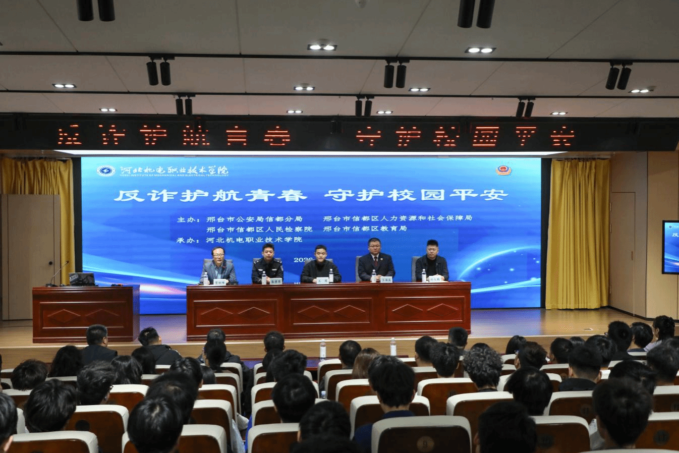 为深入落实河北省公安厅、教育厅、人力资源和社会保障厅印发的《全省反诈宣传进校园集中活动方案》要求,切实提升我校师生反诈防骗意识与自我保护能力,有效防范电信网络诈骗,守护师生财产安全与校园稳定,4月24日上午,我校在德润楼一层京东报告厅举办“反诈护航青春 守护校园平安”反诈宣传系列讲座。本次讲座特邀邢台市公安局信都分局刑警大队民警秦孝男、邢台市信都区人民检察院政治处科员王海威、邢台市信都区人力资源和社会保障局职建科孟耘可入校开展系列反诈宣传工作。安全工作处处长贾铁峰主持讲座,学生工作部部长孙大鹏及师生代表共计180余人参加讲座。