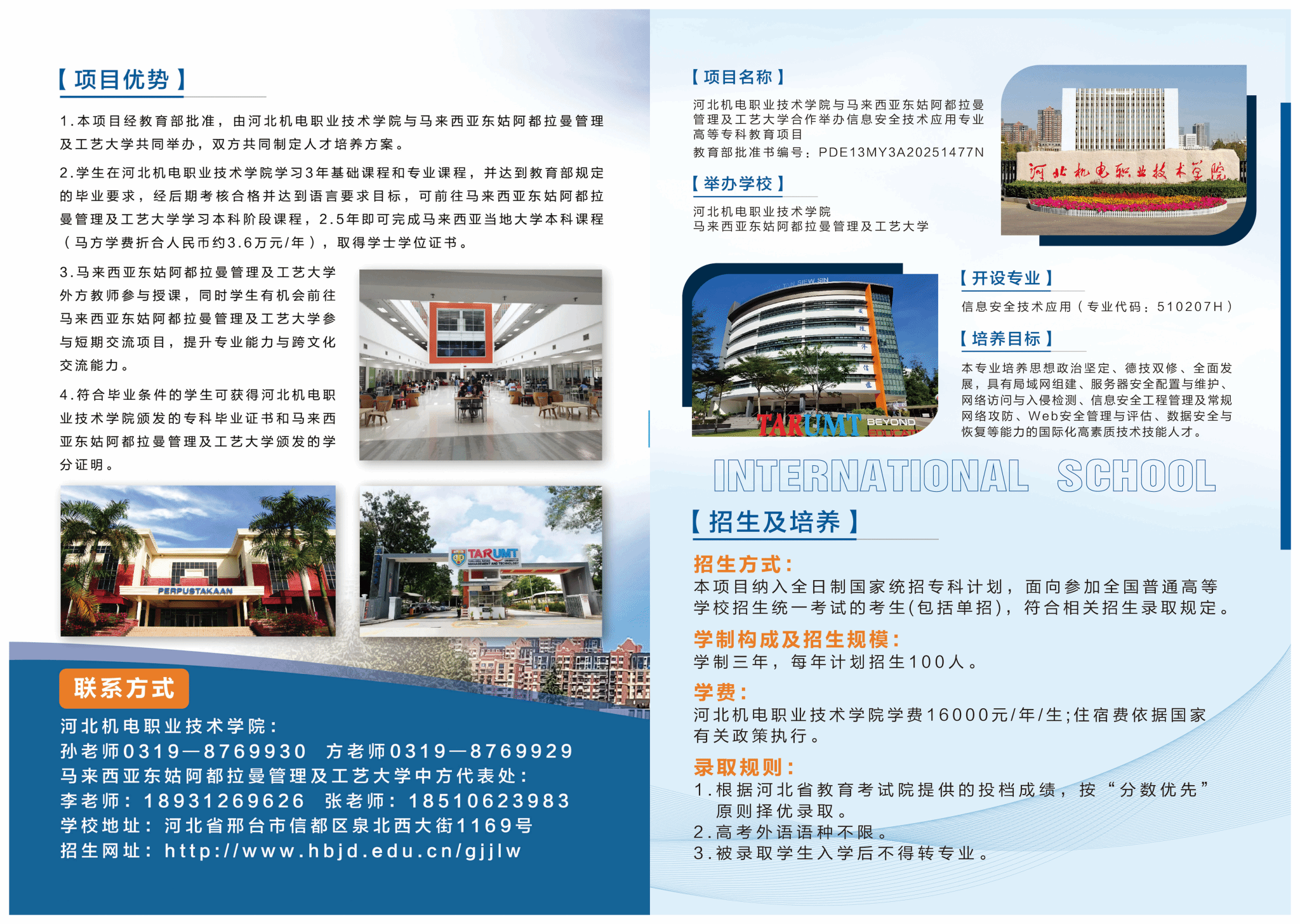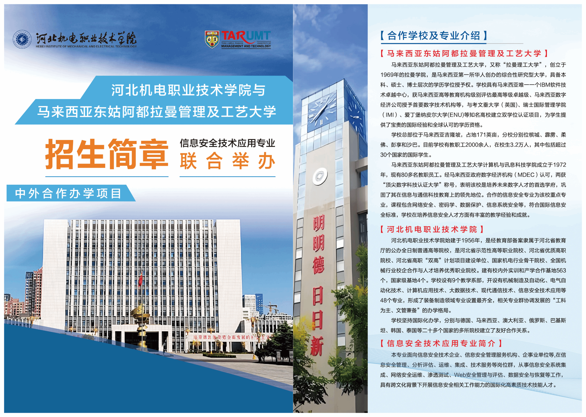 河北机电职业技术学院与马来西亚东姑阿都拉曼管理及工艺大学合作办学招生简章——信息安全技术应用专业查看人次: 发布日期:2026-03-10 附件:【2026年中马合作办学招生简章.pdf】已下载次 上一篇: 河北机电职业技术学院与俄罗斯下诺夫哥罗徳国立技术大学合作办学招生简章——机械设计与制造专业 下一篇: 河北机电职业技术学院与英国北爱尔兰东南学院合作办学招生简章——应用电子技术专业