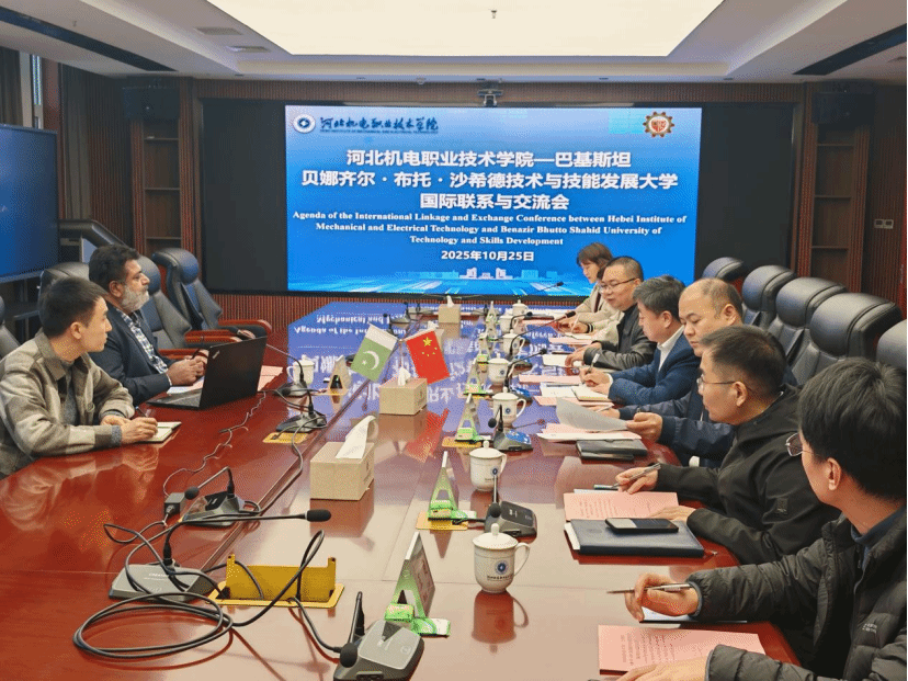 10月25日,巴基斯坦贝娜齐尔·布托·沙希德技术与技能发展大学(BBSUTSD)副校长拉苏尔·布克斯·马哈尔(Rasool Bux Mahar)到访我校进行国际交流和洽谈合作,副校长张能云热情接待来宾,办公室、继续教育培训部、电气工程系相关负责人参加会谈。会上,张能云代表学校向马哈尔的再次到来表示真挚的欢迎,介绍了我校办学建设成就及国际合作情况,并就共建师生互访、“中文+职业技能”等合作项目进行交流洽谈。他提出两点倡议,一是通过建立互惠交流与合作机制,...