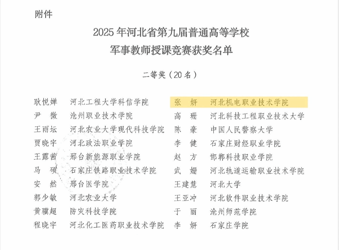 近日,由河北省教育厅、河北省军区战备建设局联合举办的“河北省第九届普通高等学校军事教师授课竞赛”在石家庄举行,我院机械工程系辅导员张妍代表学院参赛,最终在全省95名参赛选手中脱颖而出,斩获二等奖。