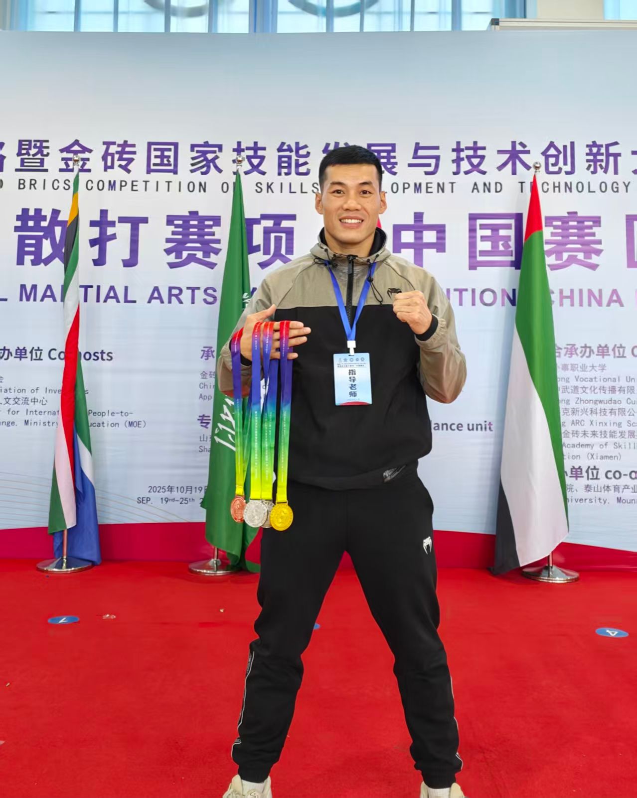10月19日至25日,2025一带一路暨金砖国家技能发展与技术创新大赛之首届武术散打赛项(中国赛区)在山东外事职业大学举办。本次赛事共有全国55所院校、381名选手参加,我校代表队在领队耿晓东及教练员赵蒙、李涛、杜先刚的带领下,凭借过硬实力与顽强斗志斩获一等奖2项、二等奖2项、三等奖4项,在国家级赛场充分展现我校体育育人成效与竞技风采!