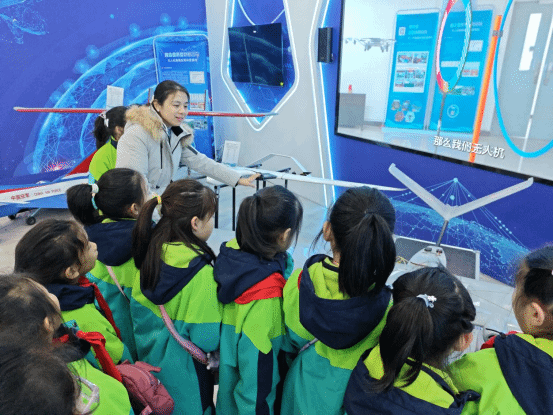走进无人机智能应用科普基地,一场空中编队表演瞬间点燃了现场气氛。数十架无人机如灵动的“空中精灵”同步升空,迅速在空中完成列队集结。伴随着音乐变换出多样造型,仿佛在空中上演一场“科技舞蹈”,酷炫的视觉效果引发学生们阵阵欢呼。随后在基地讲解员的带领下,学生们参观了无人机展示区。从迷你消费级无人机到工业级专业设备,从多旋翼无人机到固定翼机型,各类功能各异的无人机整齐陈列,讲解员详细介绍了无人机的发展历程、技术原理及核心部件,孩子们好奇地驻足观察,不时举手提问,现场互动氛围热烈。