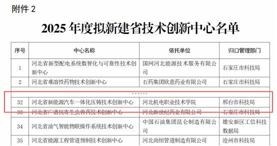 近日,河北省科技厅公布了2025年拟新建省重点实验室和省技术创新中心名单,由我校牵头申报的“河北省新能源汽车一体化压铸技术创新中心”成功获批建设。这是我校继河北省机电装备智能先进控制技术创新中心、河北省技术转移中心之后,获批的第3个省级科研平台,标志着我校在科技创新建设方面取得新的重要突破。