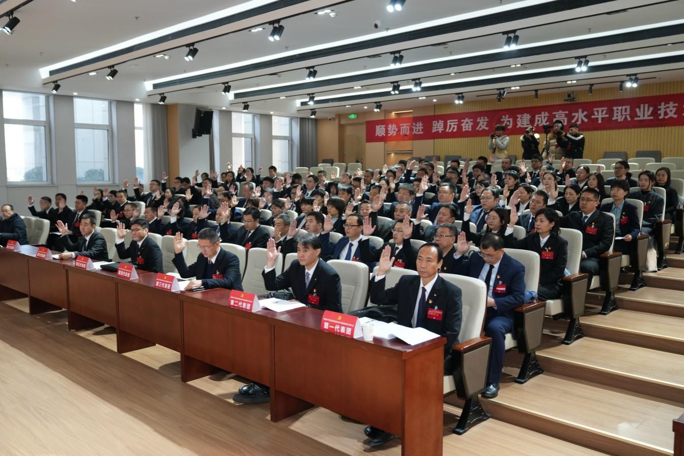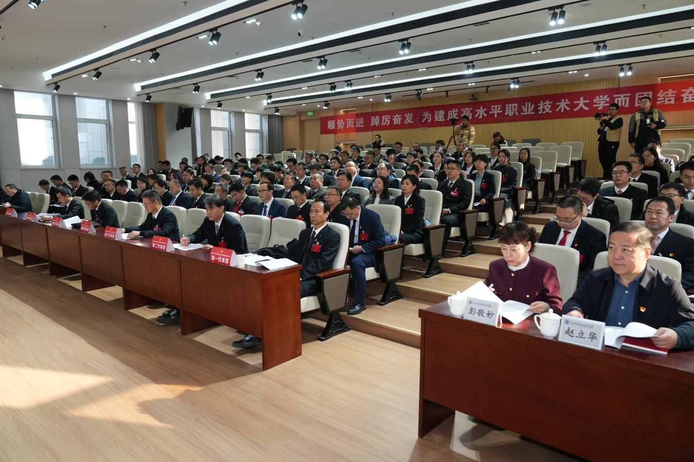 大会听取和审议了党委书记王晓凤同志代表中国共产党河北机电职业技术学院第三届委员会作的题为《顺势而进 踔厉奋发 为建成高水平职业技术大学而团结奋斗》的工作报告。