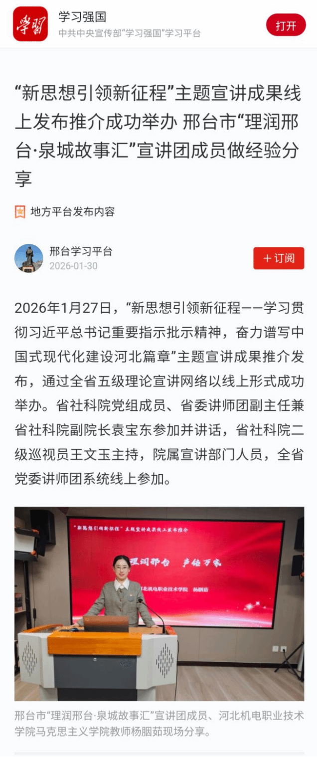 2026年1月30日,中宣部“学习强国”平台转载报道了我校马克思主义学院教师杨胭茹作为邢台市“理润邢台·泉城故事汇”宣讲团成员,在“新思想引领新征程——学习贯彻习近平总书记重要指示批示精神,奋力谱写中国式现代化建设河北篇章”主题宣讲成果推介发布会的经验分享,介绍了邢台在推动党的创新理论大众化、本土化方面的特色实践。