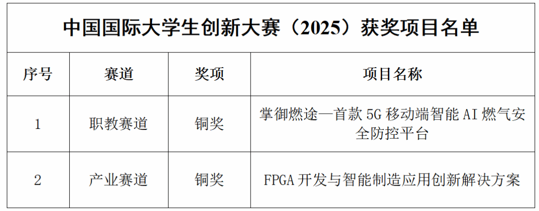 近日,教育部公布中国国际大学生创新大赛(2025)获奖结果,我校两个参赛项目凭借突出的创新实力与应用价值,荣获国赛铜奖。其中,《掌御燃途—首款5G移动端智能AI燃气安全防控平台》斩获职教赛道铜奖,《FPGA开发与智能制造应用创新解决方案》摘得产业赛道铜奖,展现了学校在创新创业教育领域的过硬实力与优异成绩。