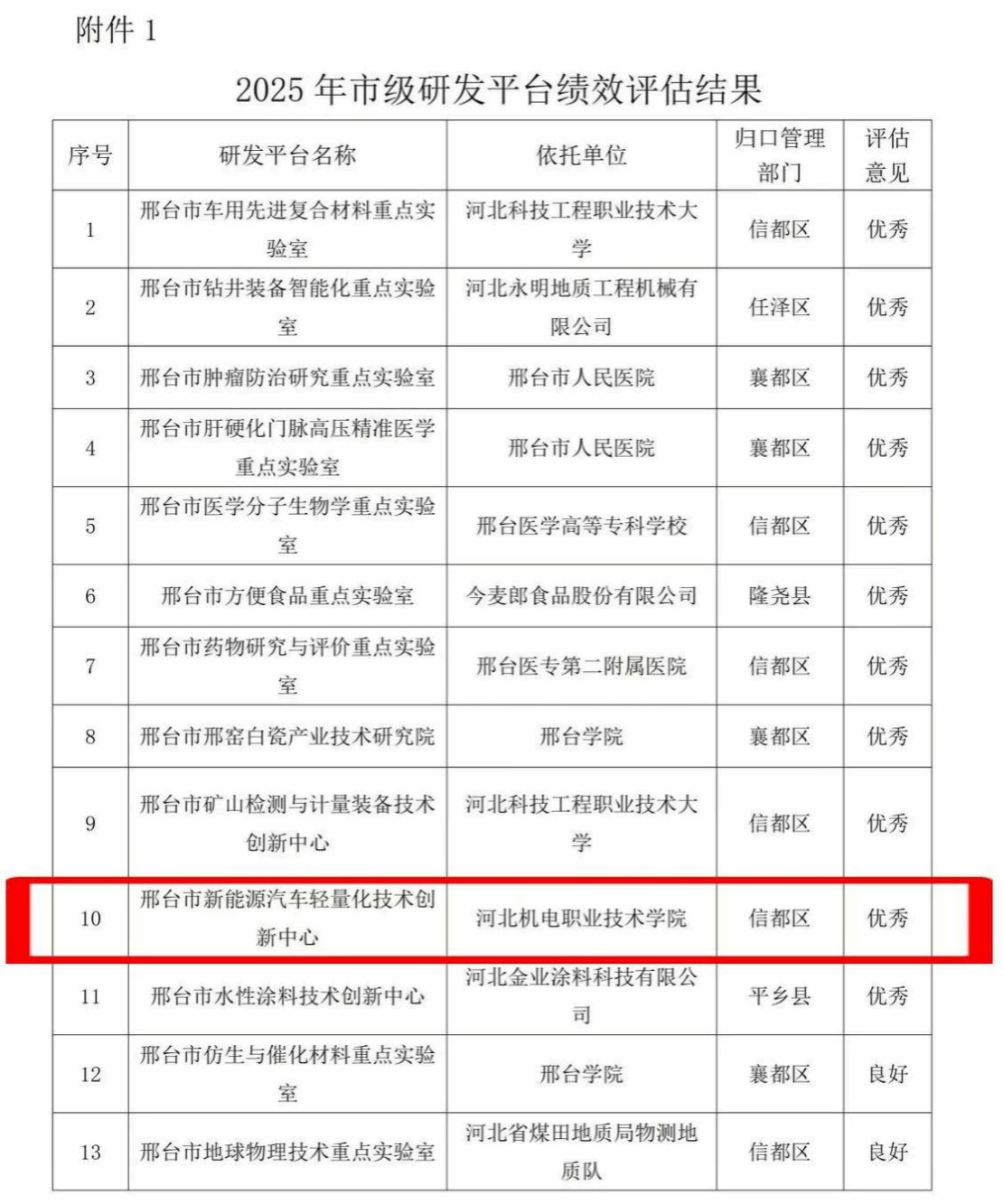 近日,邢台市科学技术局正式公布2025年市级研发平台绩效评估结果,我校汽车工程系建设的邢台市新能源汽车轻量化技术创新中心凭借扎实的科研实力与突出的创新成果成功获评优秀等次,为我校科研平台建设再添亮眼成绩。