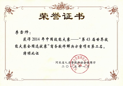 我院软件技术专业1201班路丛瑜、李雪帅同学在第43届世界技能大赛商务软件解决方案项目(中国赛区)选拔赛和“四晋二、二晋一”的比赛中分列取得第一名和第二名的好成绩,其中路丛瑜同学将于2015年8月4-19日代表中国赴巴西圣保罗参加第43届世界技能大赛。