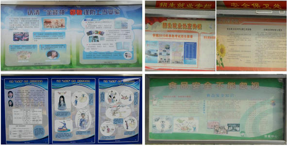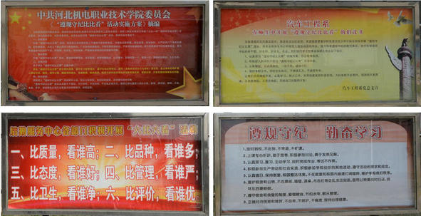 为了充分发挥校园橱窗的宣传教育功能,加强精神文明和校园文化建设。新学期伊始,我院各党总支(直属党支部)和有关部门及时更换了橱窗宣传内容,展示了党的十八届四中全会精神、2015年中央两会精神、社会主义核心价值观教育、学院“遵规守纪比比看”活动、法制教育、反邪教知识、2015年单独招生宣传、学习雷锋精神、饮食卫生和安全知识等丰富多彩的宣传教育内容,积极打造橱窗文化宣传教育阵地,成为校园文化建设和校园人文景观的亮点。(文 图 董国英 魏志强)