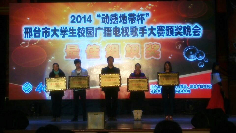 由邢台广播电台、邢台市教育局联合举办的2014邢台市大学生校园广播歌手大赛于昨天落下帷幕,参与本次大赛的学校有:邢台学院、邢台职业技术学院、河北机电职业技术学院、邢台高等医学专科学院、邢台技师学院。