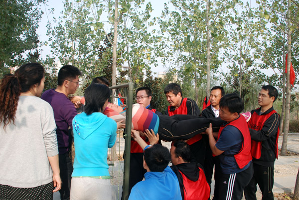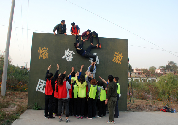 训练开始后,在专业教练的指导下,全体参训成员组成2支队伍,每支队伍快速制订各自队名、队歌、口号,形成了团队文化;选出了队长、副队长、队秘,形成了团队核心。训练中先后开展了高空断桥、攀爬天梯、穿越电网、毕业墙等拓展项目。