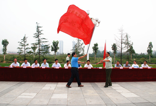 党委副书记、纪委书记徐丙谦向新生军训营营长李江授旗,李江营长代表全体参训教官承诺:全体教官将忠于职守、严于律已、服从指挥,严格要求,刻苦训练,发扬艰苦奋斗的优良作风,争创佳绩。