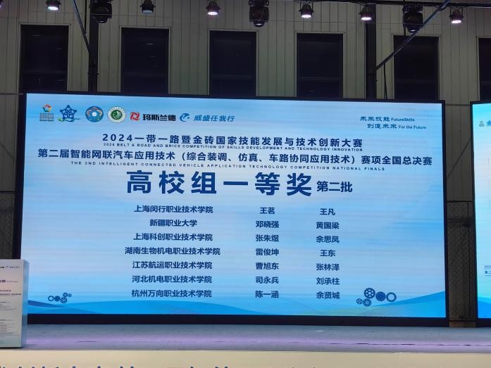 11月2日,2024一带一路暨金砖国家技能发展与技术创新大赛“智能网联汽车应用技术”赛项全国总决赛在宣城职业技术学院落下帷幕,经过激烈比拼,由我院汽车工程系教师韩龙海和王宇指导的学生刘承柱、司永兵荣获学生高校组一等奖,教师董立亮、暴焱荣获职工组二等奖。