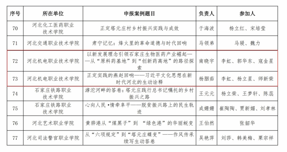 近日,河北省教育厅公布关于“新时代高校思想政治理论课河北伟大实践教学案例”评选结果,此次评选共征集教学案例319项,经专家评审,共评选出115项优秀教学案例。我校南晓宇老师主持申报的案例《以新发展理念引领石家庄生物医药产业崛起--从“原料药基地”到“创新药高地”的路径探索》、杨胭茹老师主持申报的案例《正定实践的燕赵回响--习近平文化思想在新时代河北的生动诠释》成功入选。