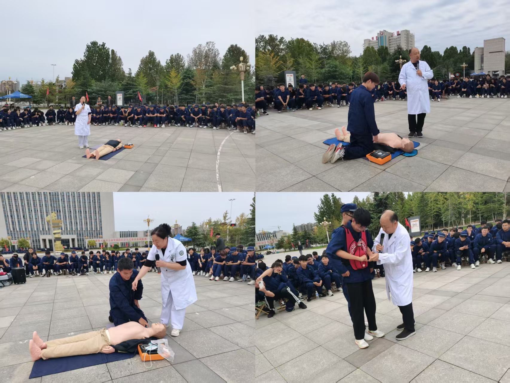 此次培训紧扣“实用、实战、实效”原则,将专业医疗资源“搬进”军训现场,打破传统安全教育“单向灌输”的局限。医护团队结合真实临床案例,先用通俗易懂的语言讲解急救原理:从心肺复苏“黄金 4 分钟”的生死意义,到 AED的核心步骤,再到海姆立克法的科学原理,让学生明白“为何要救”,随后通过模拟人演示、教学设备实操,逐环节拆解动作要领,明确按压深度、频率、电极片粘贴位置等关键细节,手把手指导“该怎么救”。