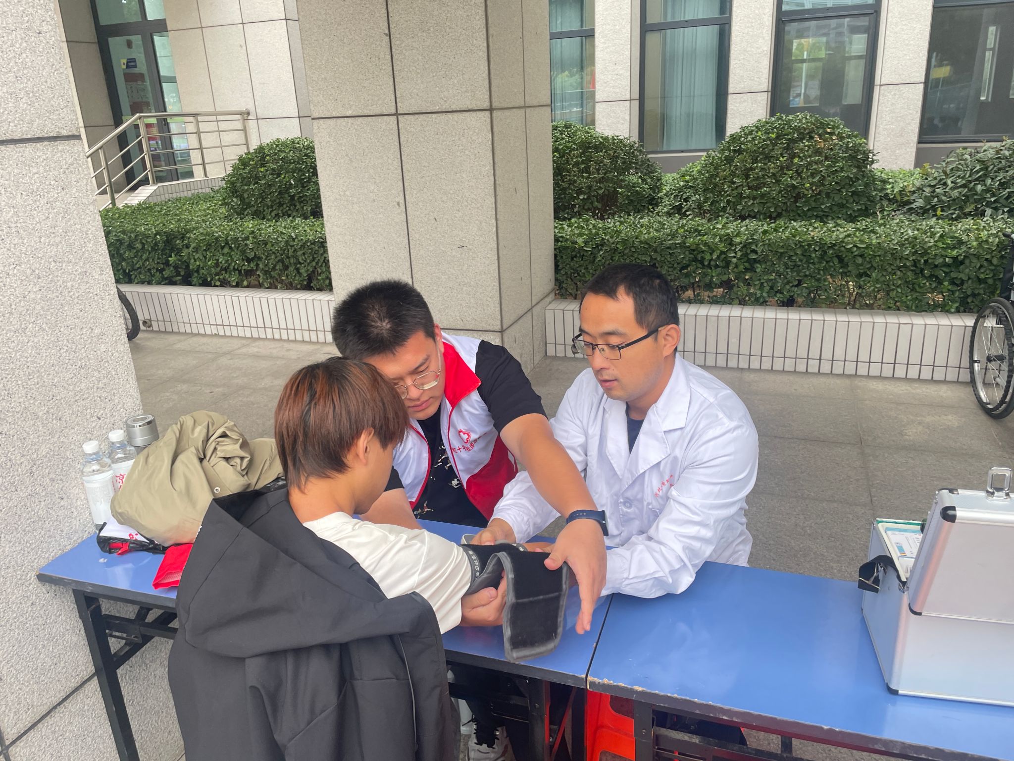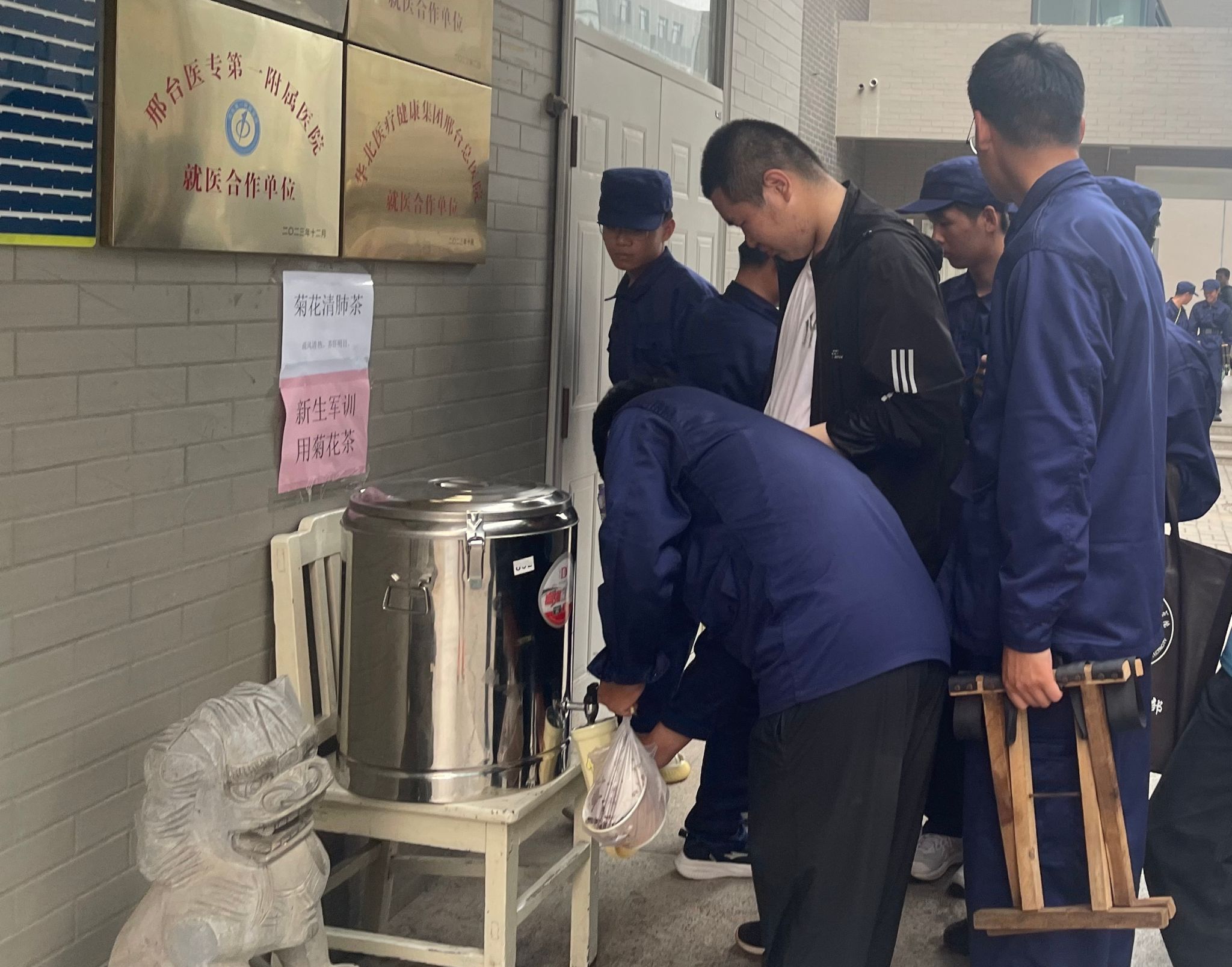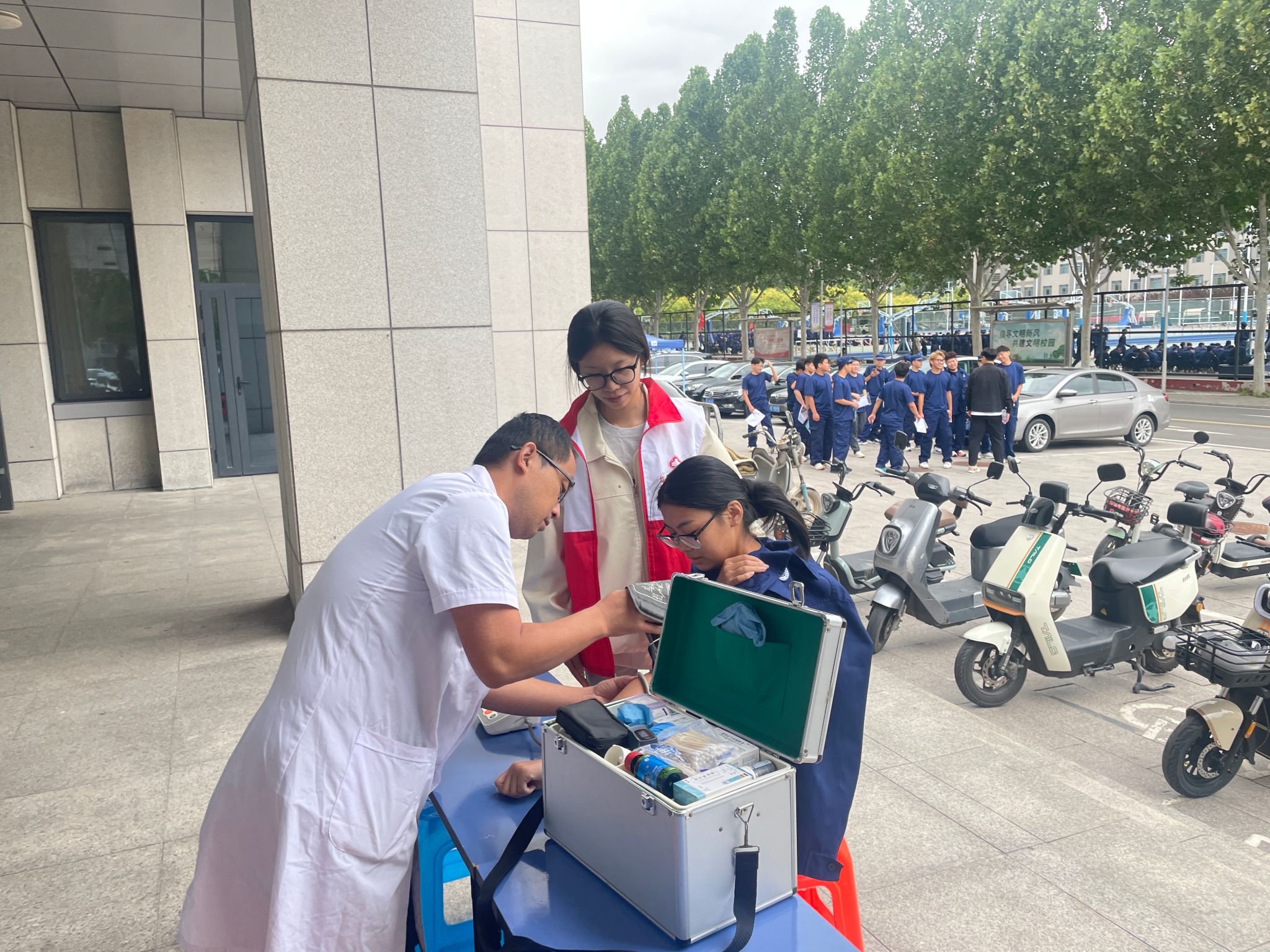 全程值守,守护军训安全 “生命线”。军训期间,新生需在户外进行长时间队列训练,高温、体力消耗大等因素易引发中暑、擦伤、肌肉拉伤等健康问题。为此,医务室在军训指挥中心设立临时医疗点,配齐急救箱、轮椅、诊查床等基础医疗设备,储备藿香正气水、清凉油等防暑药品,以及云南白药、碘伏、纱布、创可贴等外伤处理用品,安排1名专业医护人员与1名社团志愿者全程在岗值守,确保各类突发健康状况能第一时间响应、第一时间处置。另外,面对激增的就诊需要,医务人员都主动加班加点,以保障就诊学生能得到及时诊治;同时,考虑到高温天气对新生身体的影响,每日专人负责烧水泡制菊花茶饮,为新生补充水分、清热解暑,用细节传递校园关怀。