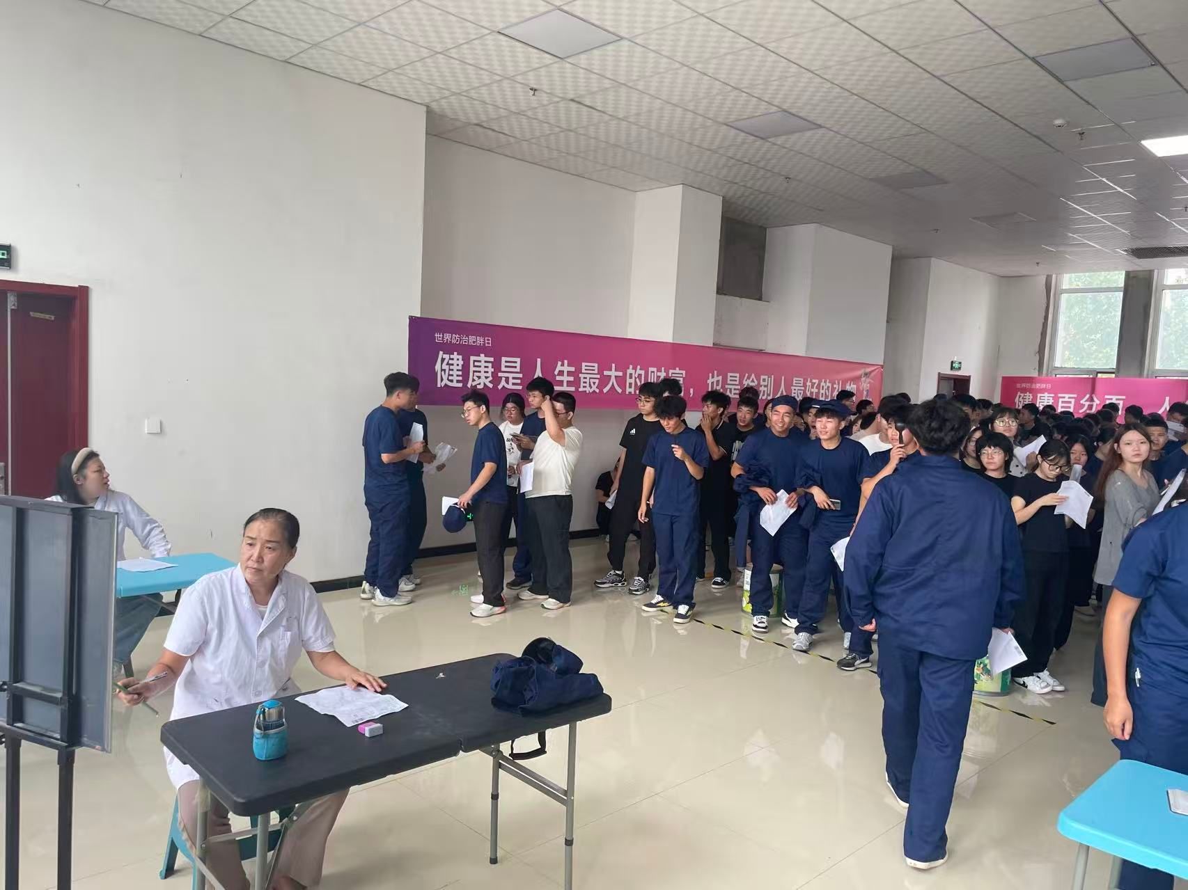 周密部署,筑牢新生健康 “第一关”。为确保新生体检工作高效有序推进,医务室在前期进行了细致筹备。一方面,提前与招生就业处、学生工作部、各系部及医院沟通协调,根据各系部新生人数、军训安排等制定分批次体检方案,避开教学与军训训练高峰时段,减少对新生日常安排的影响;另一方面,优化体检流程,设置采血、胸透、其他检查如心电图、身高体重测量、视力检查、内科问诊等 3个专项检查区域,每个区域安排专人引导,有效避免拥堵,提升体检效率。体检过程中,医护人员严格遵循医疗规范,对每一项检查数据仔细核对、精准记录。针对部分新生可能存在的视力异常、血压偏高等情况,医护人员当场给出健康指导,并建立 “一人一档” 健康档案。
